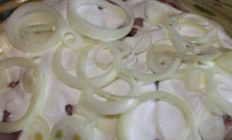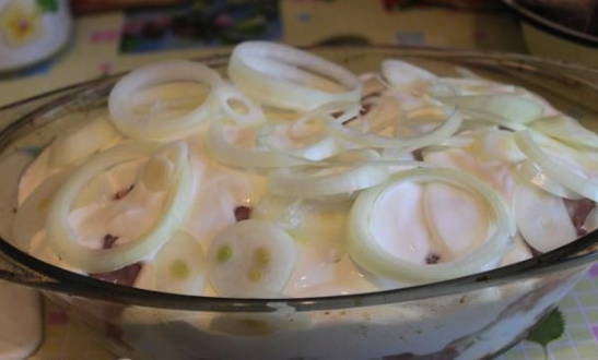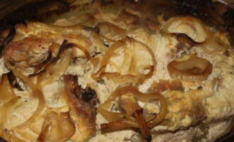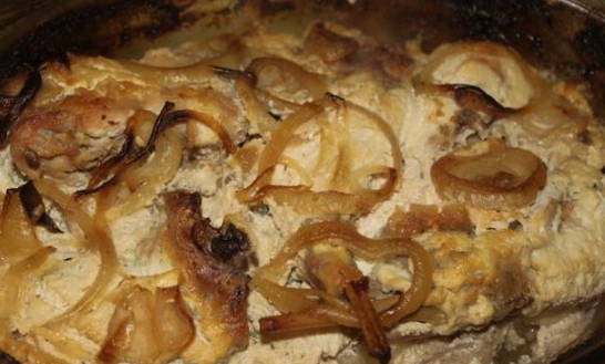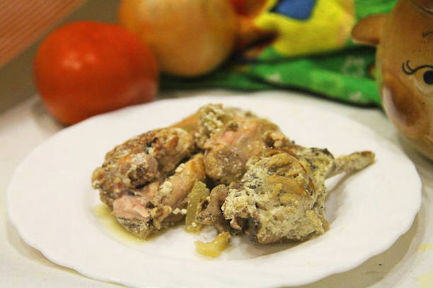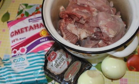 - Doe het konijnenvlees met uien in een hittebestendige pan. We vallen in slaap, het product met zout en kruiden naar smaak. Giet zure room en water. De laatste moet alle ingrediënten volledig bedekken.