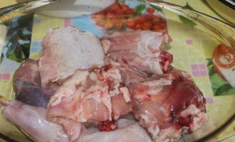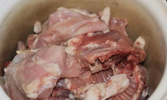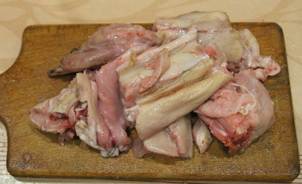 - We ontdooien en wassen het konijnenkarkas, verdelen het met een bijl in kleine delen.