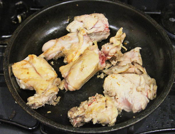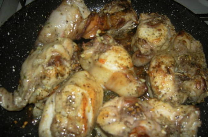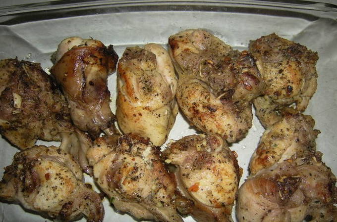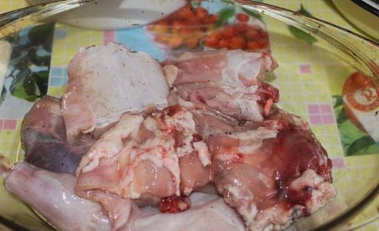 - We snijden het konijn in stukjes. Bestrooi ze met zout, kruiden en gehakte knoflook. Meng ijverig.