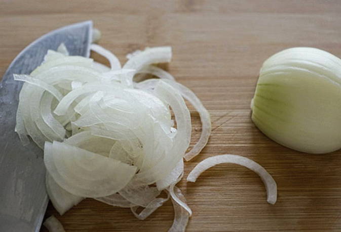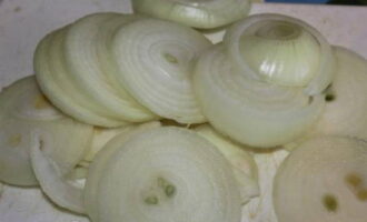 Snijd vervolgens de ui in dunne halve ringen.
