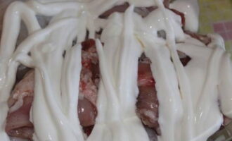 Vul het vlees met zure room. Verdeel het gelijkmatig over het konijn.