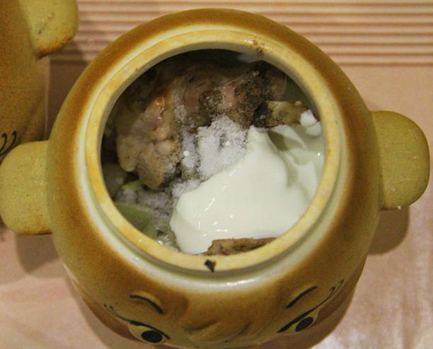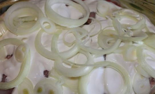 - Giet zure room over het vlees en voeg gehakte teentjes knoflook toe. Roer en laat 20 minuten marineren.