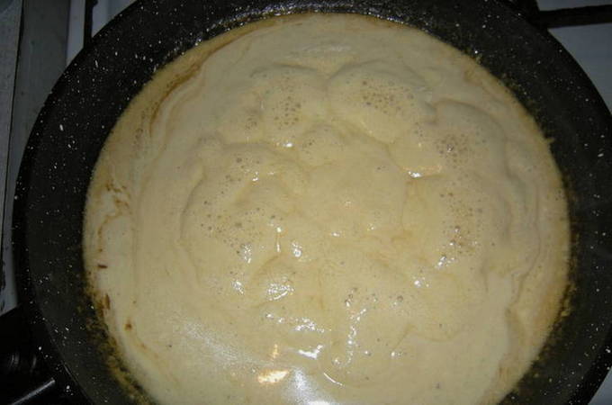 - Laten we nu beginnen met de saus. Giet de droge wijn bij de olie die nog in de pan zit. Voeg na het verwarmen zure room, zout en kruiden toe. Laat ongeveer 3 minuten op laag vuur sudderen, onder voortdurend roeren.