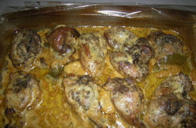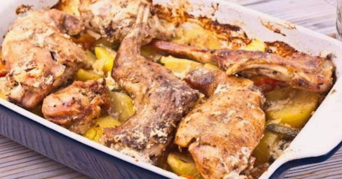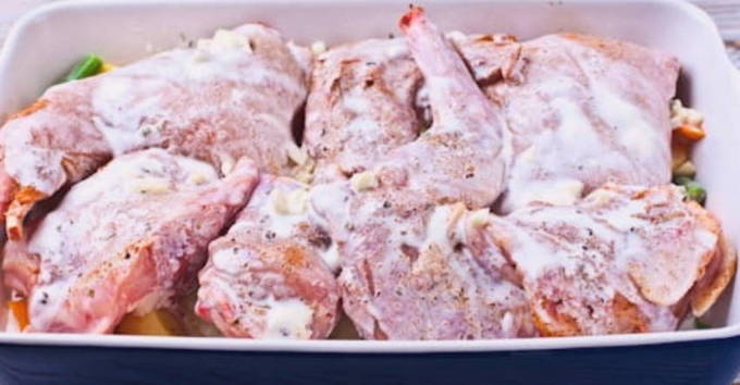 Delicaat konijn met zure room en knoflook in de oven