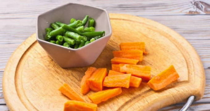 - Snijd de wortel in dunne staafjes. Bereiding van de sperziebonen.