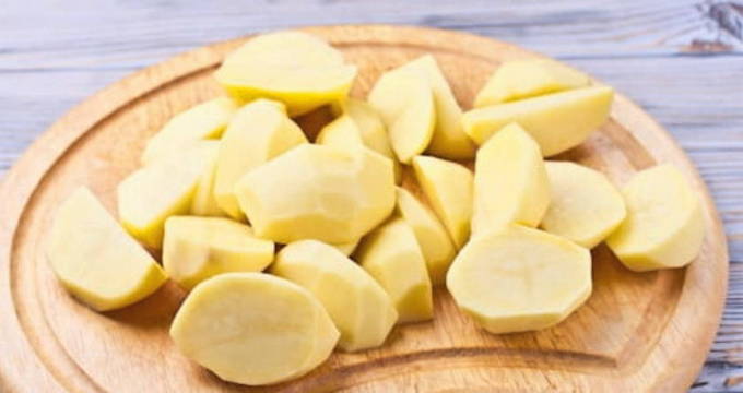 - We wassen de geschilde aardappelen en verdelen in middelgrote partjes.