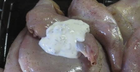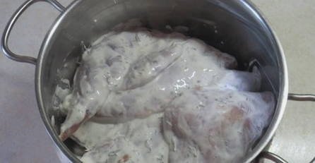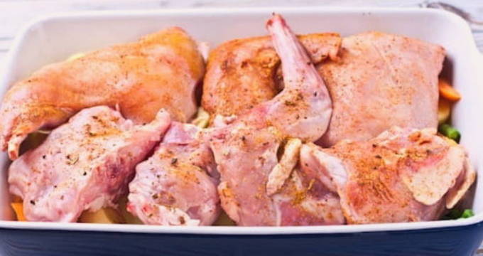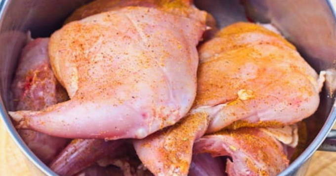 - We doen het konijn in een diepe kom, wrijven met zout en kruiden naar smaak.
