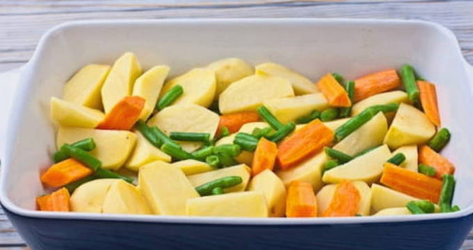 - Leg de aardappelen met andere groenten op een ingevette bakplaat.