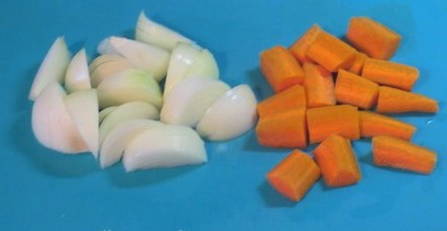 - Snijd de uien en wortelen fijn.