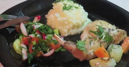 - We zetten groenten. We binden de mouw en koken het gerecht 50-60 minuten op 180 graden.