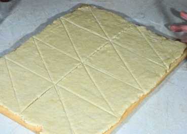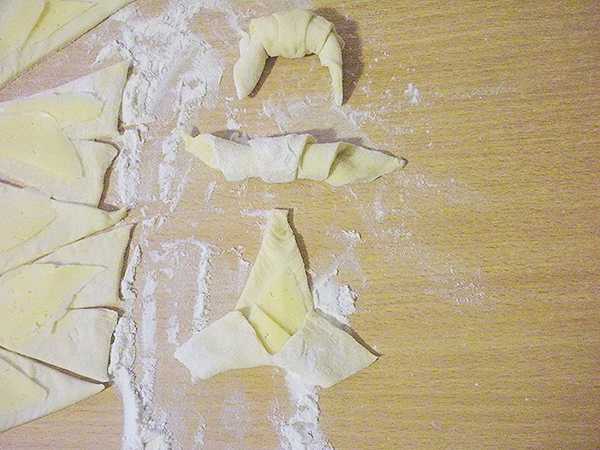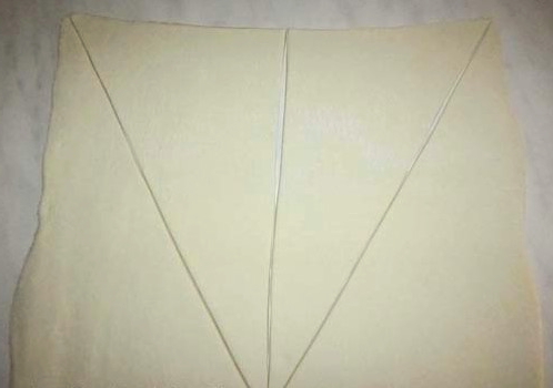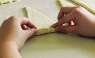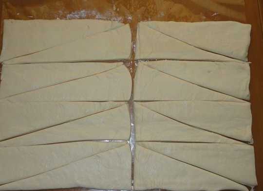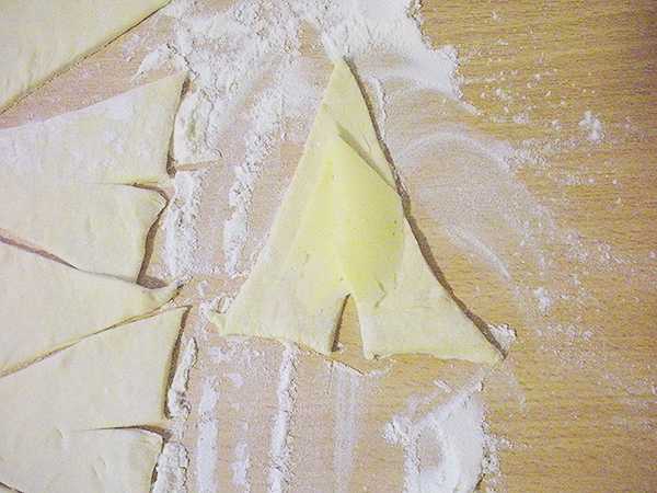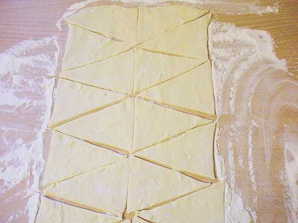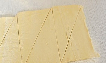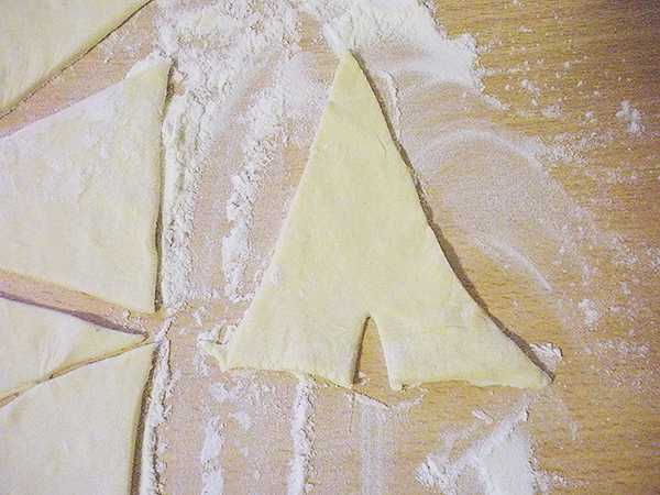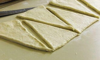 - Eerst snijden we het deeg in gelijke vierkanten, dan verdelen we ze in rechthoeken, die we op hun beurt diagonaal snijden. We krijgen grote driehoeken. Ongeveer 12 van hen zullen worden vrijgegeven.