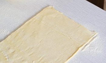 - Ontdooi het bladerdeeg en rol het een beetje uit met een deegroller. Daarna snijden we het in grote identieke driehoeken.