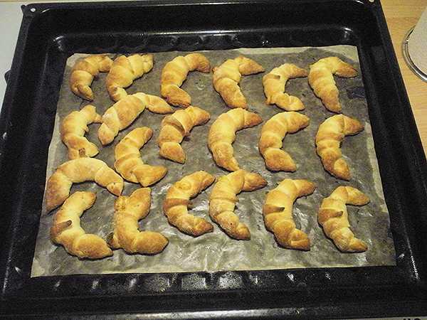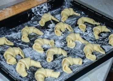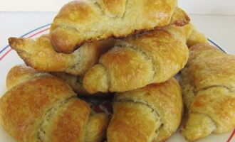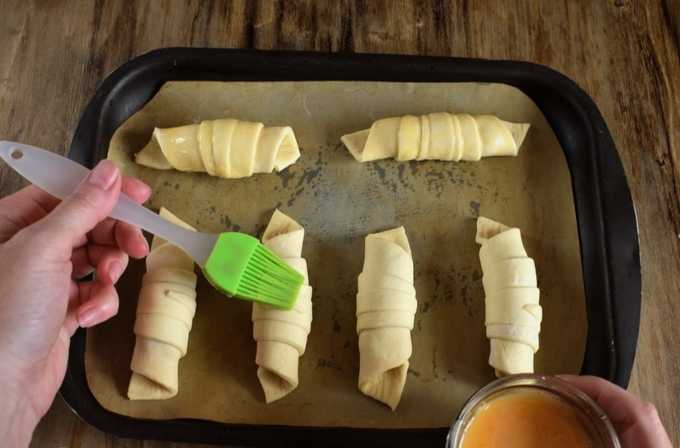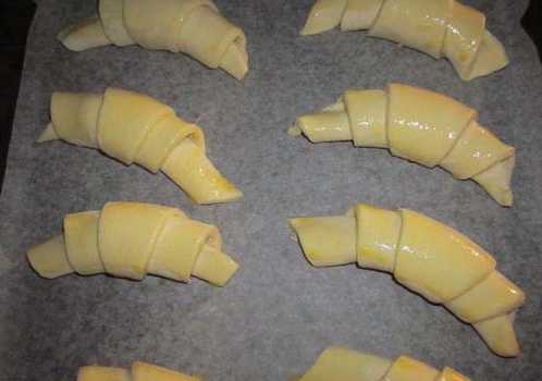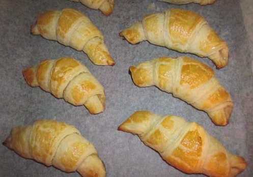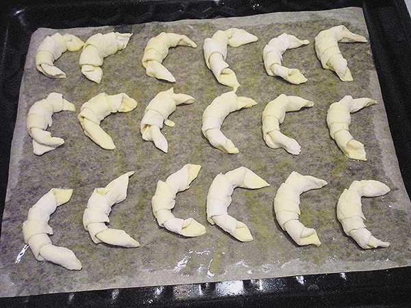 - Draai de driehoekjes tot een croissantvorm. Bedek met losgeklopt ei en leg op een bakplaat. We bakken 35 minuten in de oven op een temperatuur van 180-200 graden.