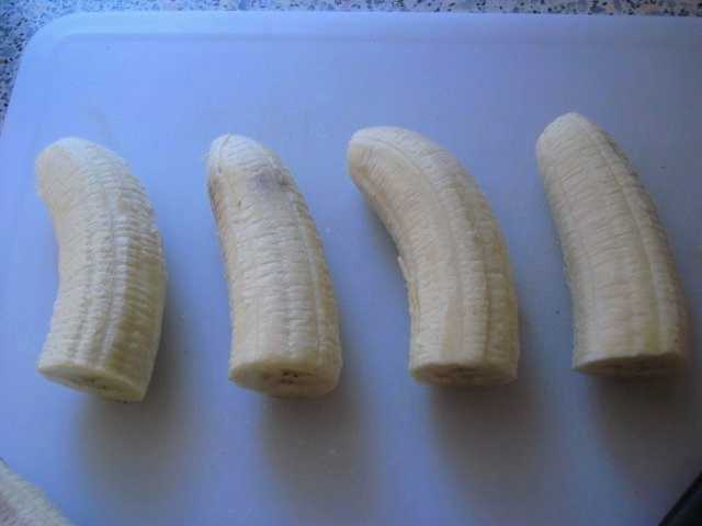 - Schil vervolgens de bananen en snijd ze elk in 3-4 stukken.