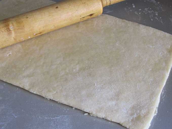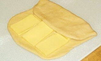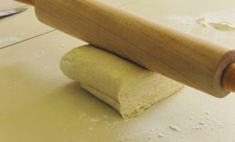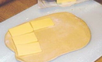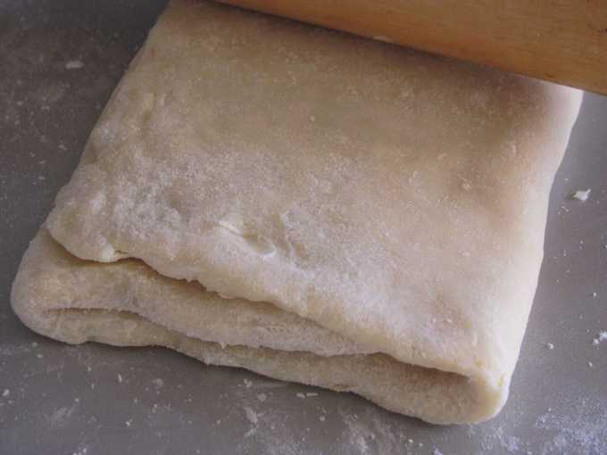 - Leg dunne boter op een laag deeg. We wikkelen het deeg meerdere keren. Dan rollen we het uit en vouwen het terug in dezelfde vorm. Koel 15 minuten in de vriezer.
