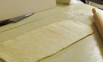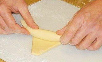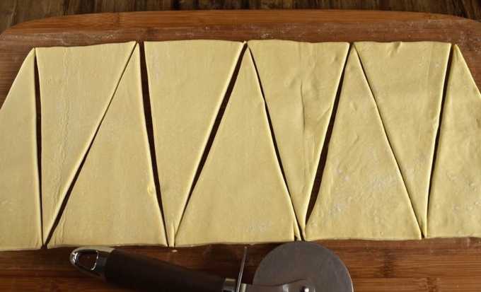 - Zet het bladerdeeg op een warme plaats en wacht tot het zacht wordt. Bestrooi het vervolgens met een kleine hoeveelheid bloem en rol het een beetje uit. We verdelen de laag in grote identieke driehoeken.