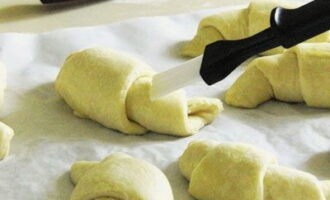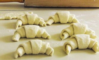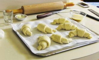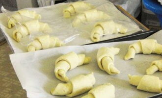 We leggen perkament op een bakplaat, waar we croissants van bladerdeeg gistdeeg verspreiden. Dek ze af met huishoudfolie en laat 30-40 minuten op een warme plaats staan.
