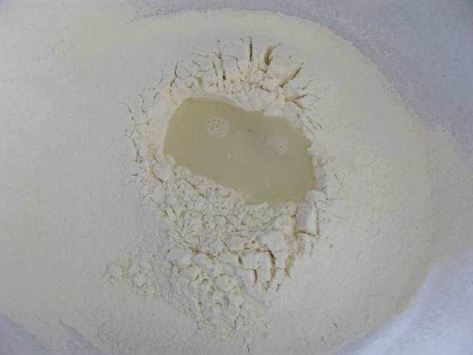 - Zeef twee glazen bloem in een diepe kom. Giet afgekoeld gekookt water in het midden van het mengsel. Voeg hieraan zout, citroensap en 50 gram gesmolten boter toe.