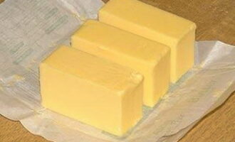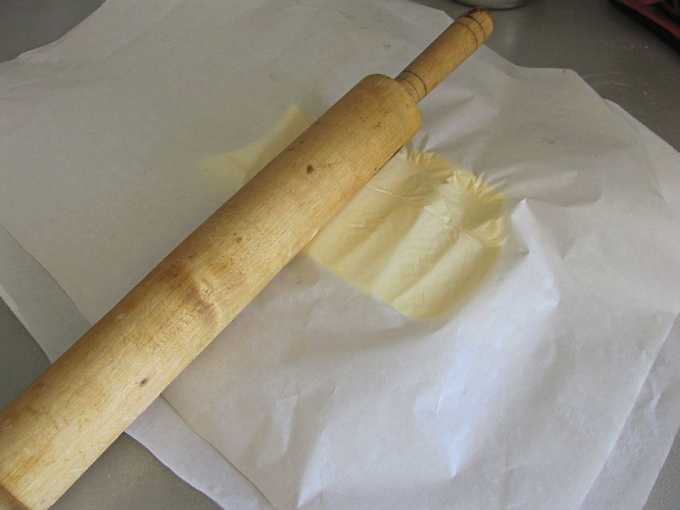 - Nu halen we de resterende 200 gram boter eruit. Laat het product een beetje smelten, leg het dan tussen twee vellen papier en rol het in een dunne laag. We sturen om in de koelkast te bevriezen.