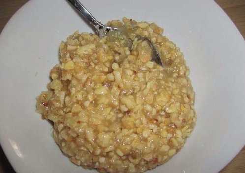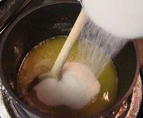 - Giet suiker in vloeibare boter, roer en kook enkele minuten tot het oplost. Verwijder het resulterende mengsel van de kachel en laat het afkoelen.