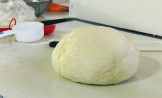 Kneed het deeg lang met je handen tot een gladde en zachte klont is verkregen. Daarna zetten we het 1-1,5 uur op een warme plaats.