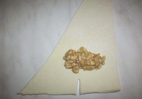 - Maak aan de basis van elke driehoek een kleine snede en plaats 1-2 theelepels honing en notenvulling iets hoger.