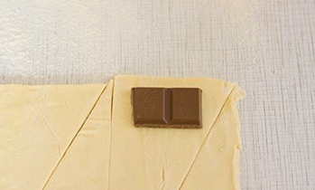 - We beginnen de chocolade in het deeg te wikkelen en krijgen een croissant in de gewenste vorm.