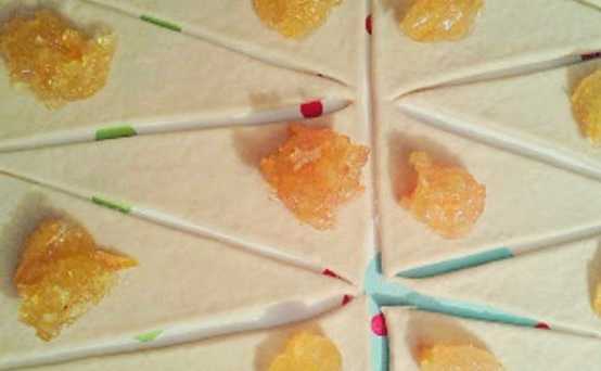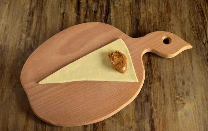 - Leg een theelepel jam op de basis van elke driehoek deeg. We kiezen elke delicatesse naar smaak, maar het is wenselijk dat deze zo dik mogelijk is.
