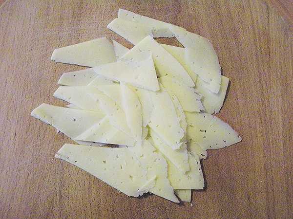 - Laten we de vulling voorbereiden. Snijd de harde kaas in dunne kleine driehoekjes.