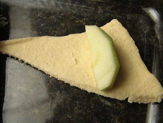- Leg een schijfje appel op de basis van elke driehoek gemaakt van deeg.
