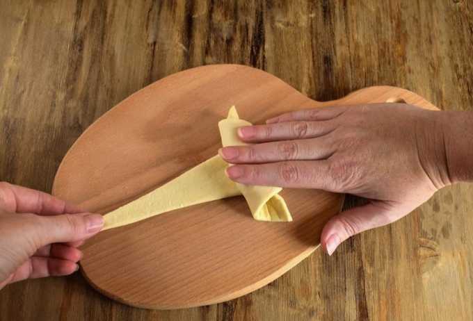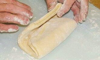 - We draaien het gevulde deeg. We beginnen dit te doen vanaf de kant waar de snede is gemaakt.