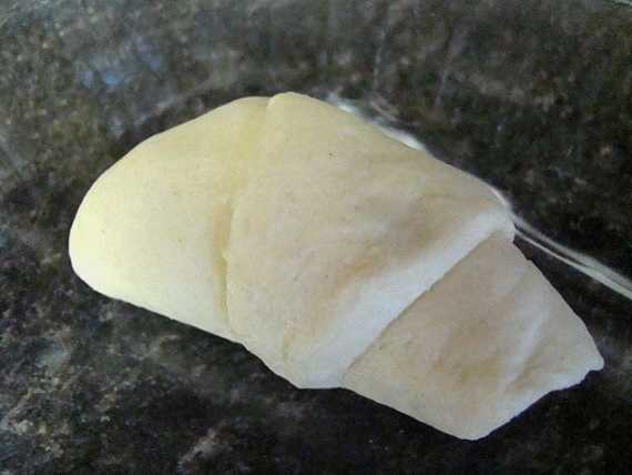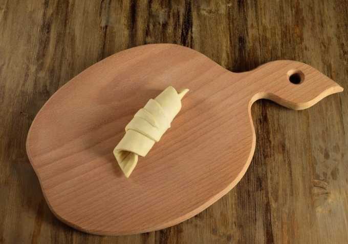 - Plaats zo'n stuk banaan op de basis van elke driehoek. We draaien het product, waardoor het de gebruikelijke croissantvorm krijgt. We fixeren het werkstuk voorzichtig met een dunne punt.