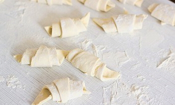 - Ontdooi bladerdeeg zonder gist bij kamertemperatuur. Strooi vervolgens bloem over het product. Je hoeft niet uit te rollen, de croissants moeten weelderig blijken te zijn.