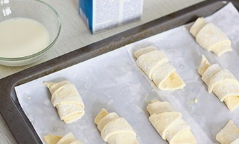 - Bestrooi croissants vochtig met melk met een beetje suiker. We sturen de bakplaat gedurende 25 minuten naar een voorverwarmde oven op 180 graden.
