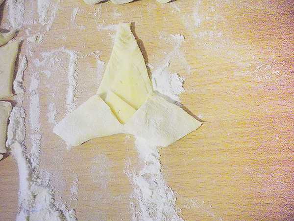 - Rol het goed gekoelde deeg dun uit en snij in driehoeken.