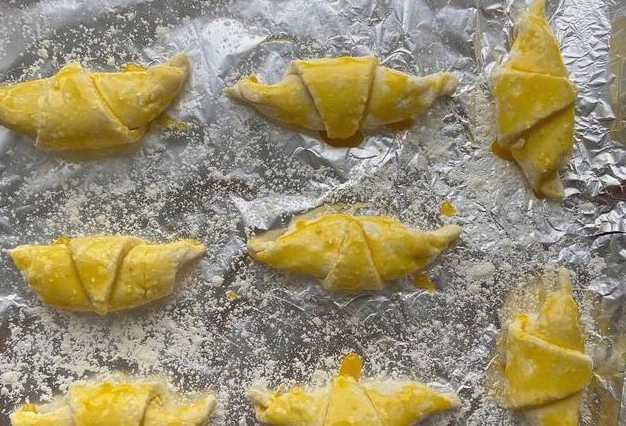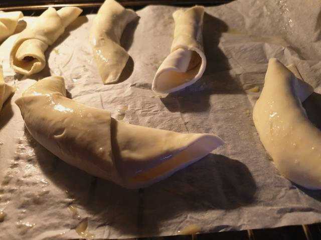 - We smeren de croissants uit op een met bakpapier beklede bakplaat en zetten in de oven op 180 graden. 20-25 minuten koken.