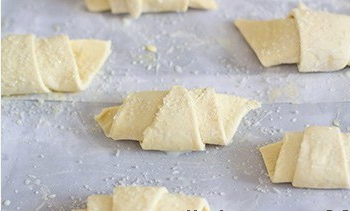 - Snijd het deeg doormidden en knip er kleine driehoekjes van gelijke grootte uit.