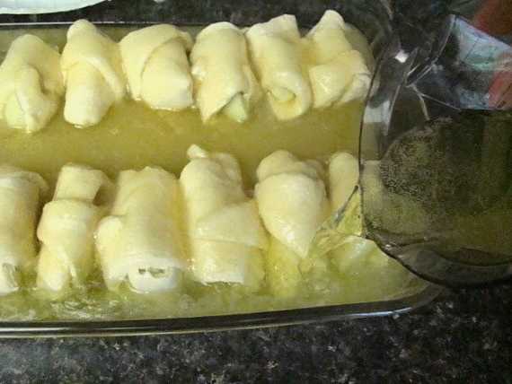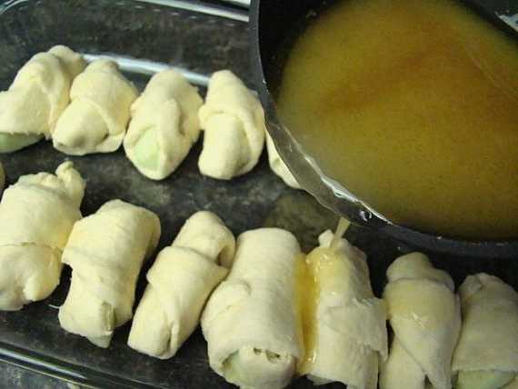 - We draaien de appel in het deeg en zetten de croissant voorzichtig vast met de punt.