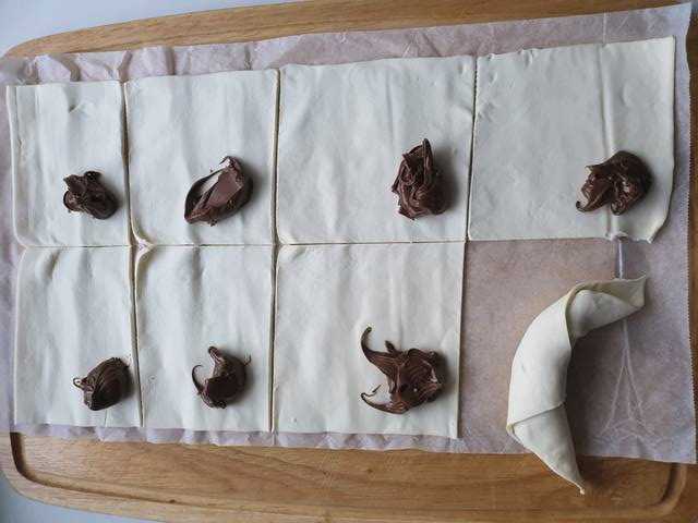 - Leg op elk deel van het gesneden deeg een theelepel nutella en vouw de blanco tot een croissant.