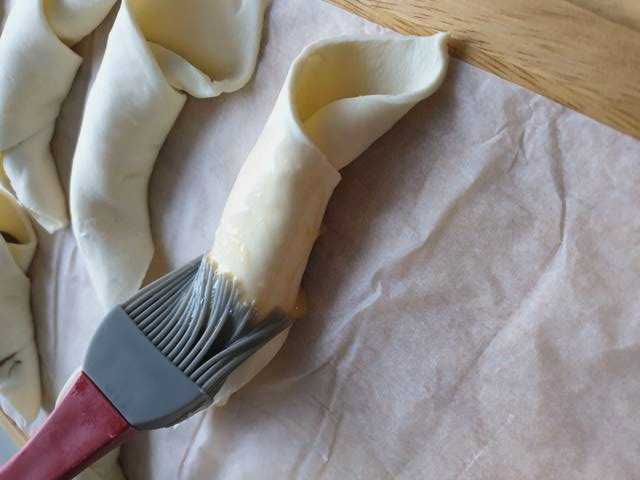 - Leg de croissants op een bakplaat met bakpapier. Bestrijk ze goed met een losgeklopt ei.