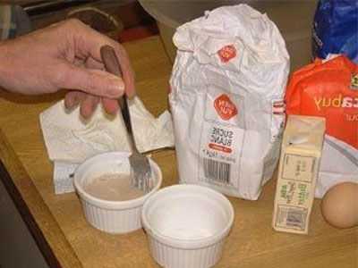 We verwarmen melk en dompelen er droge gist in. Roer en laat 15 minuten staan.