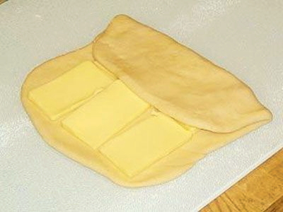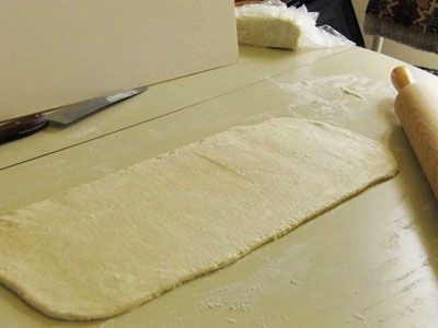 Wikkel het deeg twee keer met boter in een platte brede rol.