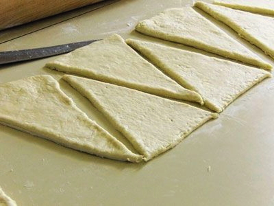- Rol het goed gekoelde deeg dun uit en snij in driehoeken.