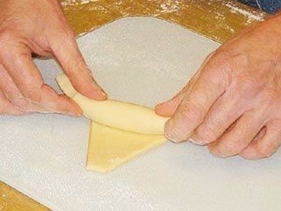 - Draai elke gevulde driehoek in een croissantvorm. We fixeren de punt zorgvuldig zodat het product in de toekomst niet afrolt.