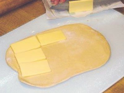 - Leg dunne boter op een laag deeg. We wikkelen het deeg meerdere keren. Dan rollen we het uit en vouwen het terug in dezelfde vorm. Koel 15 minuten in de vriezer.