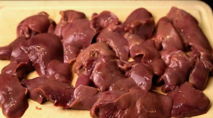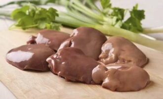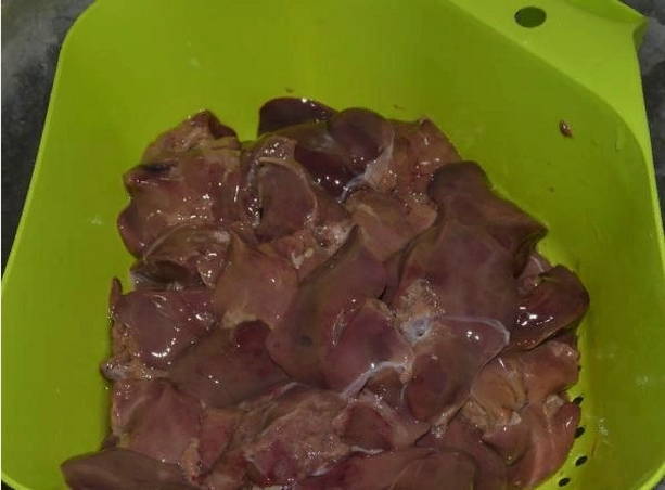 Bereid je lever voor. Heb je het ingevroren, ontdooi het dan eerst in de koelkast. Ik zou willen opmerken dat indien mogelijk nog steeds de voorkeur wordt gegeven aan gekoelde lever, het zal malser en smakelijker zijn dan bevroren. Spoel de kippenlever, laat het overtollige vocht weglopen. Verwijder vervolgens de vetstrepen en snijd de lever in kleine stukjes van uw gebruikelijke grootte.