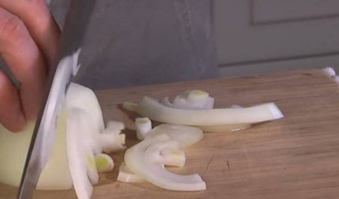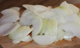 - We maken de ui schoon, spoelen hem af. Snijd elke ui in 4 stukken en vervolgens in ringen.