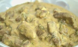 - Serveer de gekookte lever in zure roomsaus met knoflook en uien in een diep bord, spaar de saus niet. Bestrooi eventueel met verse kruiden (vergeet niet om ze eerst te wassen).
