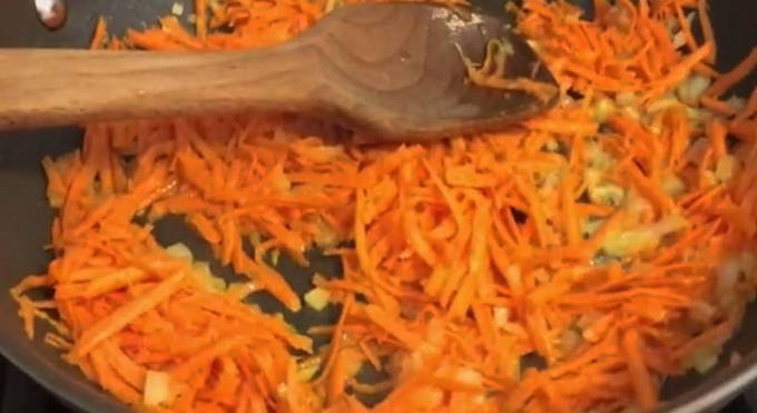 - Verhit een koekenpan op het fornuis, doe er een stukje boter in en giet er dan de plantaardige olie in.Als de olie is opgewarmd en gemengd, zet je het vuur lager en stuur je de uien en wortels om in een koekenpan te bakken. Roer de groenten, dek af en laat 10 minuten sudderen.