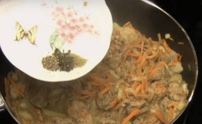 - De bereide lever moet naar de groenten worden gestuurd die in deze tijd zijn gestoofd, nadat ze er eerder in het midden van de pan ruimte voor hadden gemaakt. Dek af en laat 5 minuten sudderen, roer dan en laat nog 2-3 minuten op het vuur staan.
